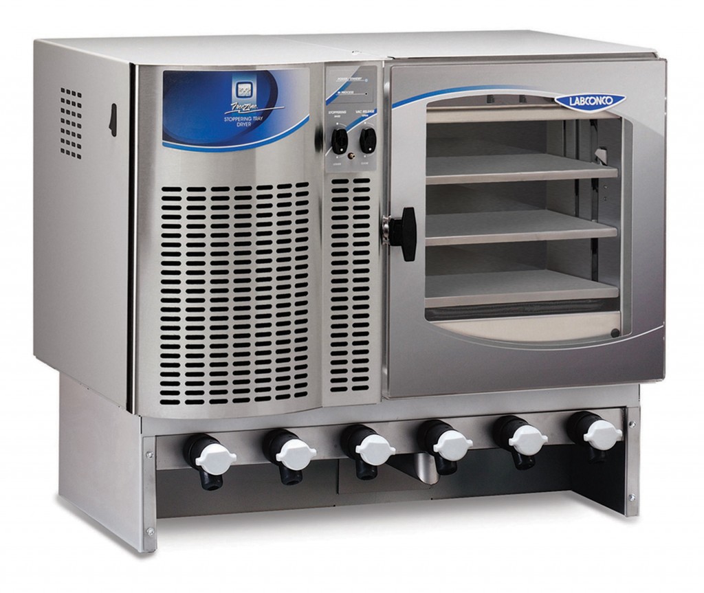 A pneumatic mechanism stoppers containers under vacuum on three large adjustable processing shelves, 16.5” x 12” each. An HCFC/CFC-free refrigeration system and electric heater cool and heat fluid medium that is circulated through the shelves to maintain shelf temperatures within ±1° C.