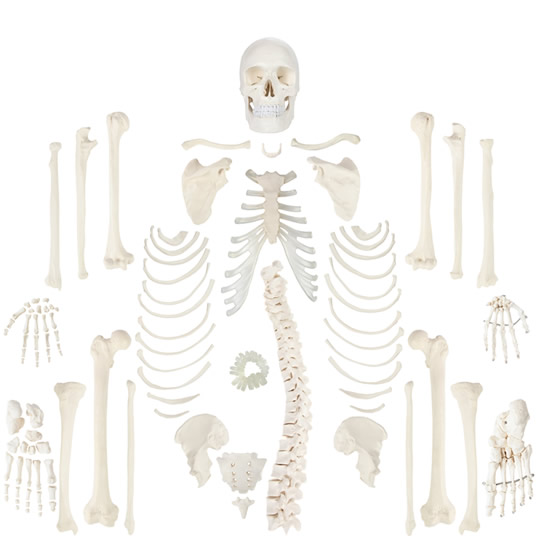 Axis Scientific presents this disarticulated version of our feature-rich anatomical skeleton. Disarticulated skeletons are ideal for study of individual bones, as well as identification practice for students. After all, identifying a femur in the context of a full skeleton is much simpler than on its own! This skeleton is complete, including a left hand which is articulated while the right hand is disarticulated, a right foot is disarticulated and the left foot is articulated, as well as the intervertebral discs, hyoid bone, coccyx, and more. The bones are bagged for convenient organization and storage, and the skull is shipped securely wrapped. Students and educators will love the combination of detail and cost offered with this exceptional disarticulated skeleton.