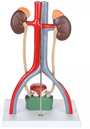 This male version of the urinary system is a great model for simple study. It includes the kidneys, adrenal gland, abdominal aorta, inferior vena cava, ureter, and bladder.