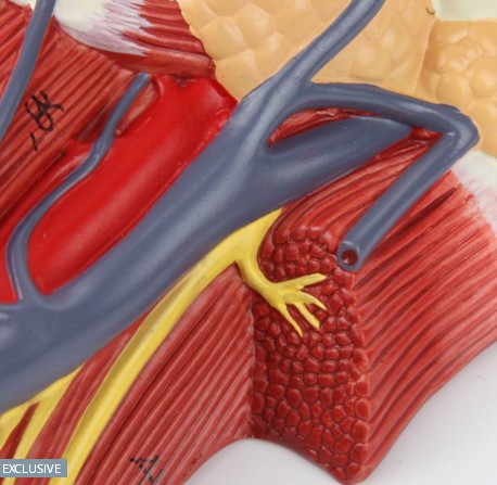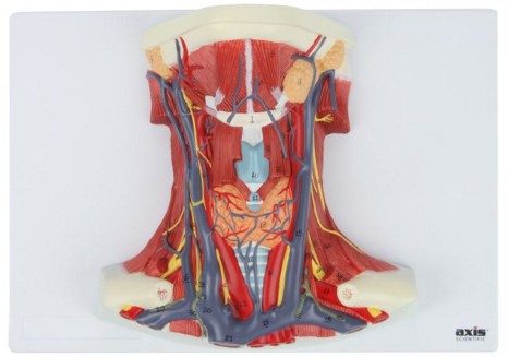 This updated Axis Scientific Neck and Throat Model includes Muscles, Veins and Arteries. The model provides a clear depiction of the throat and its anatomy. Axis Scientific includes new modeling of the arteries and veins in the throat to help patients and students get better visibility and gain a better understanding of the circulatory system in the neck region. The model is set on a base that measures 13” X 9”.